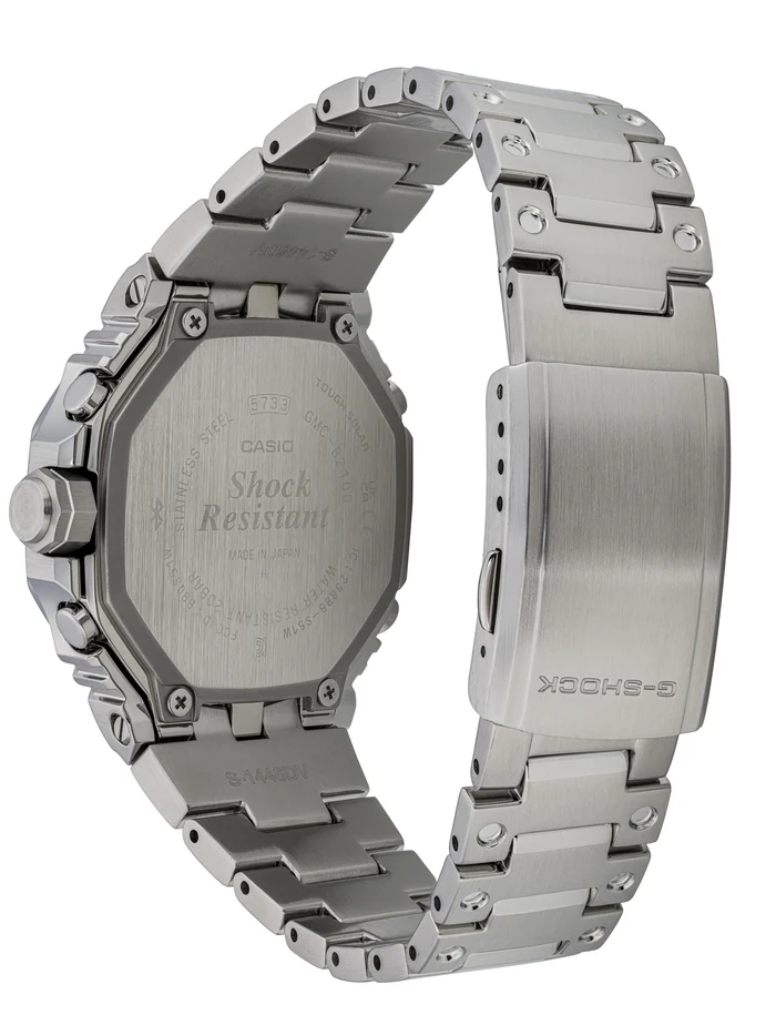 We take it way back with the octagonal bezel and dimpled band design of the original from 1983, but all done in metal with stainless-steel case, bezel, and band.