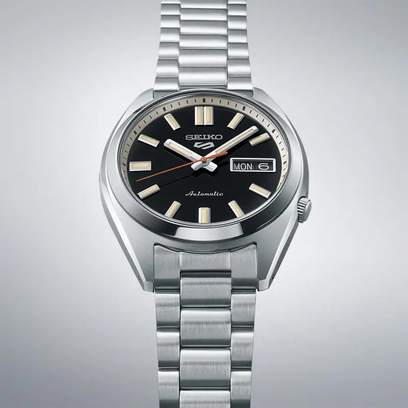 Under a semi-spherical glass, the dial features Lumibrite hands and indices, each diamond-cut with finely grooved lines, on a ‘deep black wash’ colour dial. The hands are non-triangular and are wider, to enhance the vintage retro look whilst the orange second hand is inspired by the classic 70s design. With a metal dial ring, the bracelet features striking mirror and hairline finishing.